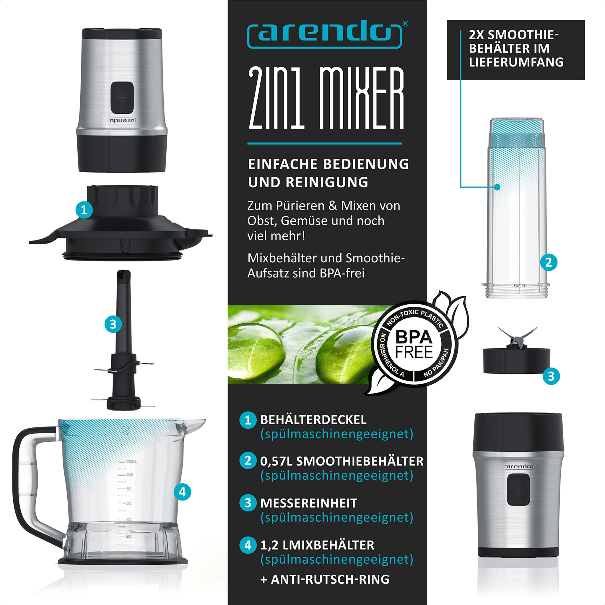 Arendo - Edelstahl Standmixer 700W - 2in1 - Smoothie Maker - 1,2l Fassungsvermögen inkl. 2x 0,57l Smoothie Mixbehälter - Mix & Go Shake Mixer - Leistungsstarkes Edelstahlmesser